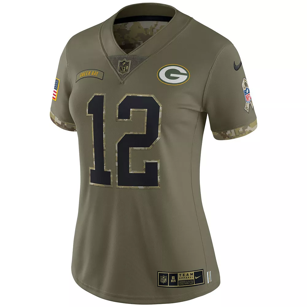 Honor our service members while supporting the Green Bay Packers with this 2022 Salute To Service Aaron Rodgers Limited Jersey. This Nike gear features a military-inspired color scheme, complete with an American flag and Salute To Service ribbon appliqu on the right sleeve. The crisp Green Bay Packers graphics and camouflage details will add some much-needed spirit to your game day collection. The NFL does not profit from the sale of Salute to Service products. Charitable contributions are awarded by the NFL Foundation to the NFL’s military nonprofit partners. For more information, please visit www.NFL.com/causes/salute.