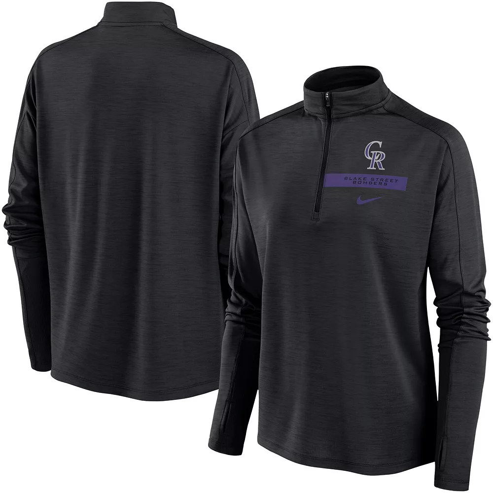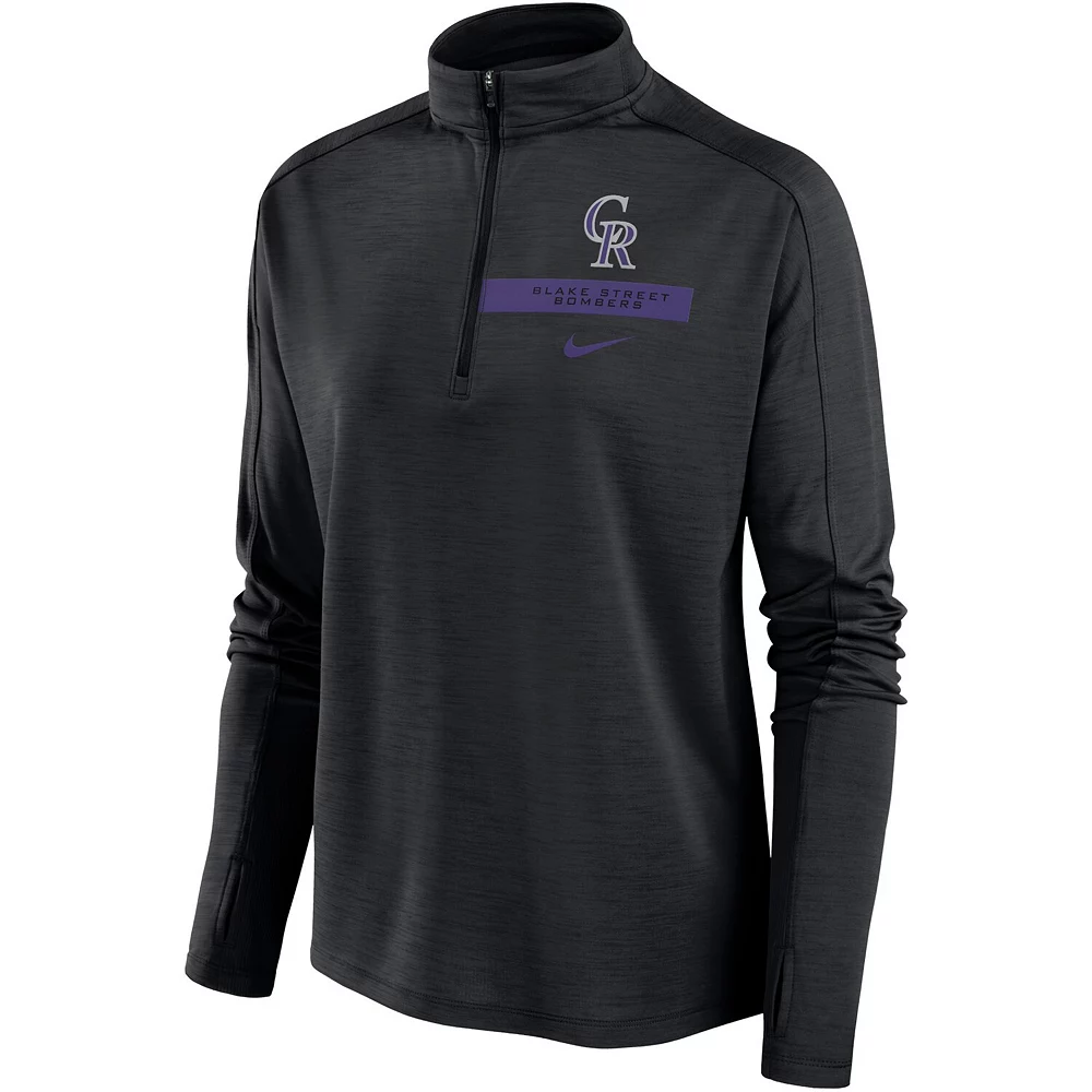 Layer up as you cheer on the Colorado Rockies with this Nike Primetime quarter-zip top. It features raglan sleeves for easy motion, and moisture-wicking Dri-FIT technology. Designed for fashion and function, this pullover is complete with stylish Colorado Rockies graphics and thumbholes.