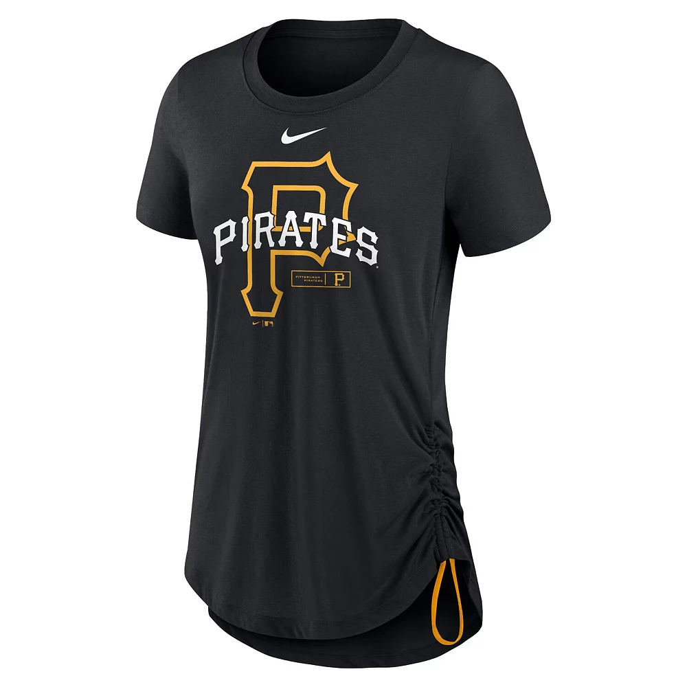 Look stylish and stay cool during the Pittsburgh Pirates season in this Side Cinch Fashion T-shirt from Nike. It features Pittsburgh Pirates graphics printed on super-soft tri-blend material. Additionally, Dri-FIT technology wicks away moisture to keep you feeling dry and comfortable.