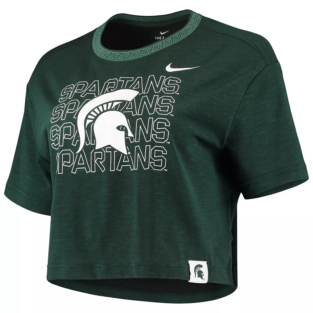 Stay dry and look stylish during the heat of summer when you wear this Michigan State Spartans Slub Ringer Cropped T-shirt from Nike. It wicks away moisture using Nike Dry fabrics with Dri-FIT technology, keeping you cool and comfortable. In addition, printed Michigan State Spartans graphics emphasized by the coordinating collar will make your team loyalty easily noticeable.