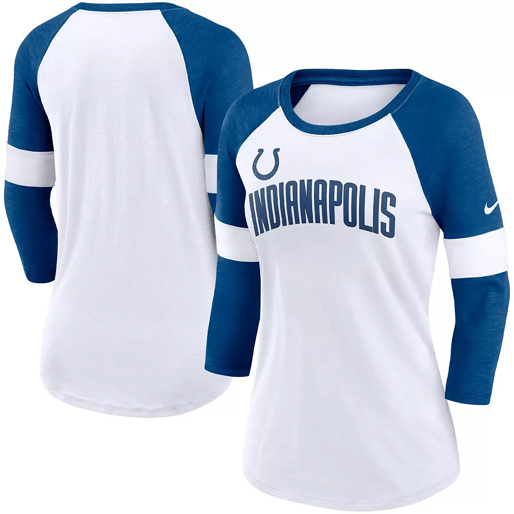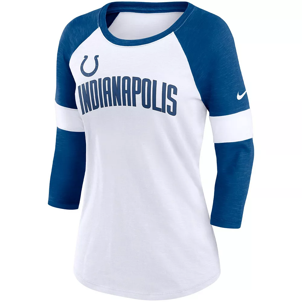 Put eyes on your Indianapolis Colts pride with this Nike Football 3/4-sleeve T-shirt. Roomy raglan sleeves and blended fabric make for the ultimate casual feel. In addition, signature Indianapolis Colts graphics and colors let everyone know who you cheer for on game day.
