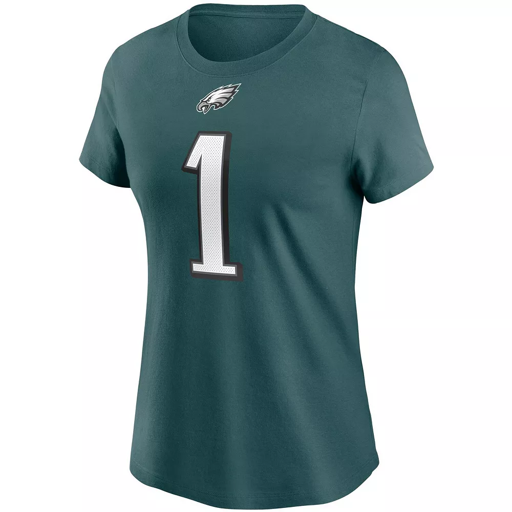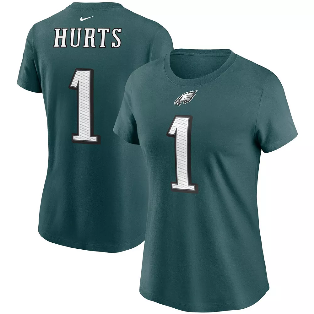 Since Jalen Hurts is your favorite player, and for good reason, show him your support by grabbing this Philadelphia Eagles Name and Number T-shirt from Nike. It features the Philadelphia Eagles logo on the front and Jalen Hurts graphics printed on the back. No one will be able to question where your loyalty lies on game day when you wear this jersey-inspired tee.