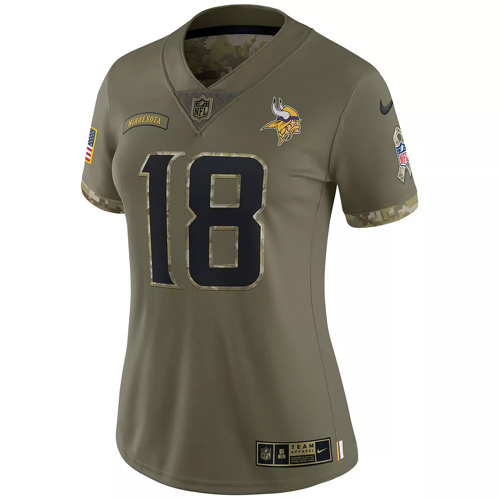 Honor our service members while supporting the Minnesota Vikings with this 2022 Salute To Service Justin Jefferson Limited Jersey. This Nike gear features a military-inspired color scheme, complete with an American flag and Salute To Service ribbon appliqu on the right sleeve. The crisp Minnesota Vikings graphics and camouflage details will add some much-needed spirit to your game day collection. The NFL does not profit from the sale of Salute to Service products. Charitable contributions are awarded by the NFL Foundation to the NFL’s military nonprofit partners. For more information, please visit www.NFL.com/causes/salute.