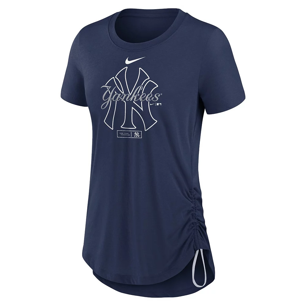 Look stylish and stay cool during the New York Yankees season in this Side Cinch Fashion T-shirt from Nike. It features New York Yankees graphics printed on super-soft tri-blend material. Additionally, Dri-FIT technology wicks away moisture to keep you feeling dry and comfortable.