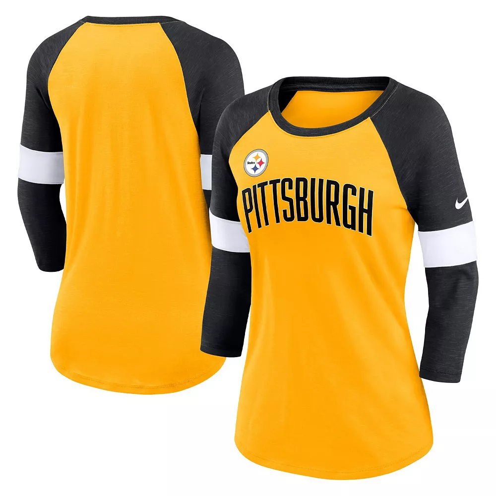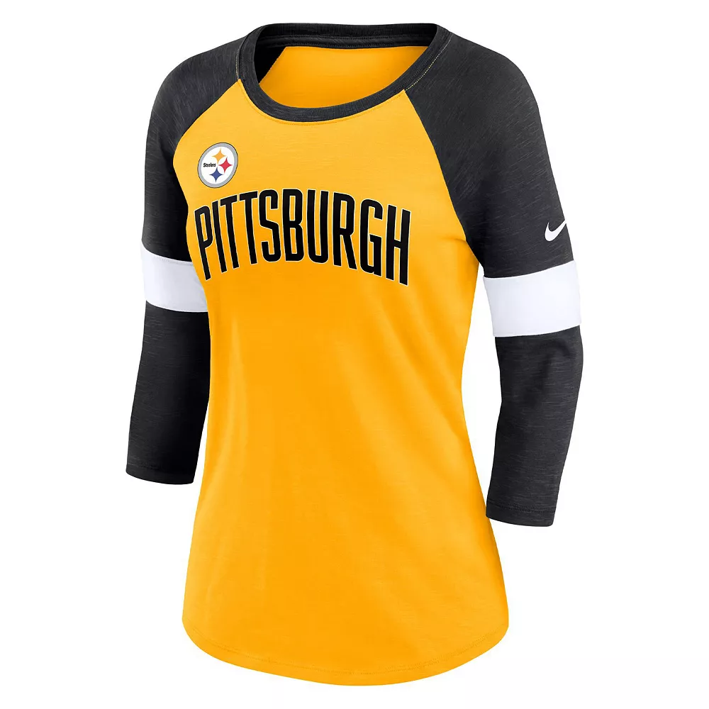 Put eyes on your Pittsburgh Steelers pride with this Nike Football T-shirt. Three-quarter raglan sleeves and slub fabric make for the ultimate casual feel. In addition, the signature Pittsburgh Steelers graphics and colors let everyone know who you cheer for on game day.