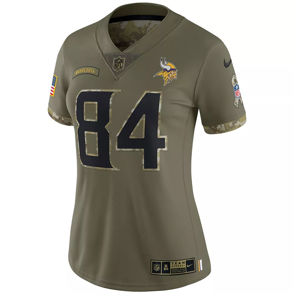 Honor our service members while supporting the Minnesota Vikings with this 2022 Salute To Service Randy Moss Retired Player Limited Jersey. This Nike gear features a military-inspired color scheme, complete with an American flag and Salute To Service ribbon appliqu on the right sleeve. The crisp Minnesota Vikings graphics and camouflage details will add some much-needed spirit to your game day collection. The NFL does not profit from the sale of Salute to Service products. Charitable contributions are awarded by the NFL Foundation to the NFL’s military nonprofit partners. For more information, please visit www.NFL.com/causes/salute.