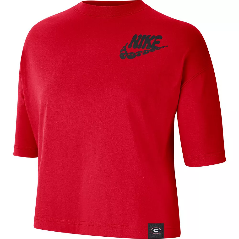 Stay cool when the Georgia Bulldogs action heats up with this stylish cropped t-shirt. This Nike tee features the classic swoosh in a throwback design and subtle team graphics on the jock tag. Whether enjoying the outdoors or watching the Georgia Bulldogs play, add a fun finish to any outfit with this cropped t-shirt.