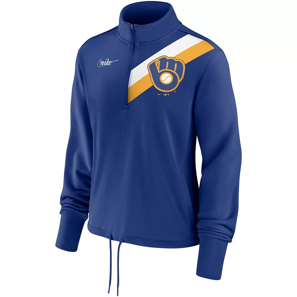 Sport this Nike Cooperstown Collection Rewind half-zip pullover each time you reminisce about the 1982 Milwaukee Brewers. It features an authentic design with the mock neck for extra coverage, fleece lining for warmth and unique adjustable waistband. Plus, the bold stripe across the chest accentuates the classic Milwaukee Brewers graphics for a standout game day layer that’s sure to draw the eye.
