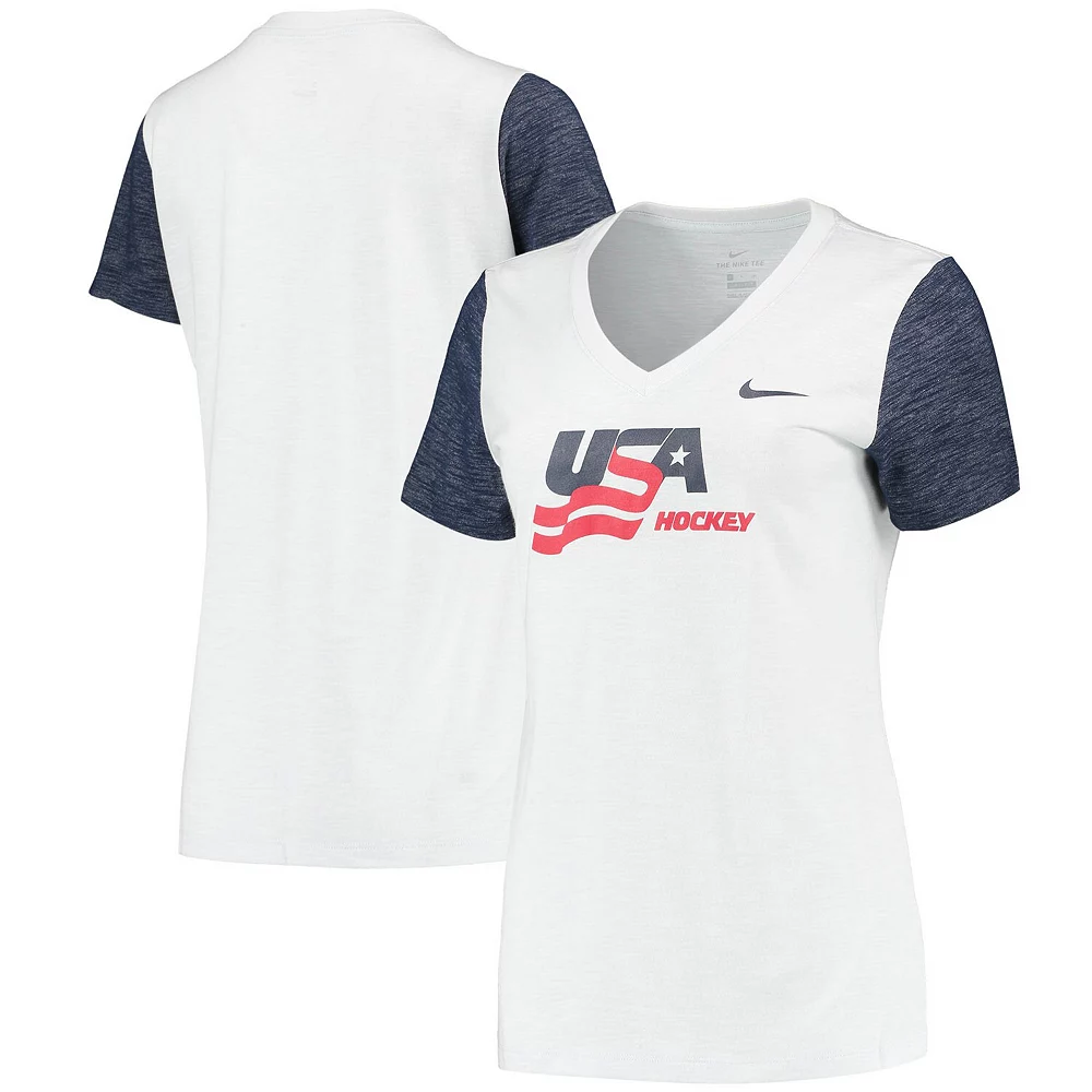 Cheer on USA Hockey as they go for the gold with this Color Block Slub T-shirt. This Nike tee features a stylish V-neck design and comfortable slub fabric. The Dri-FIT material will wick away moisture, keeping everything cool and dry when the on-ice USA Hockey action heats up.